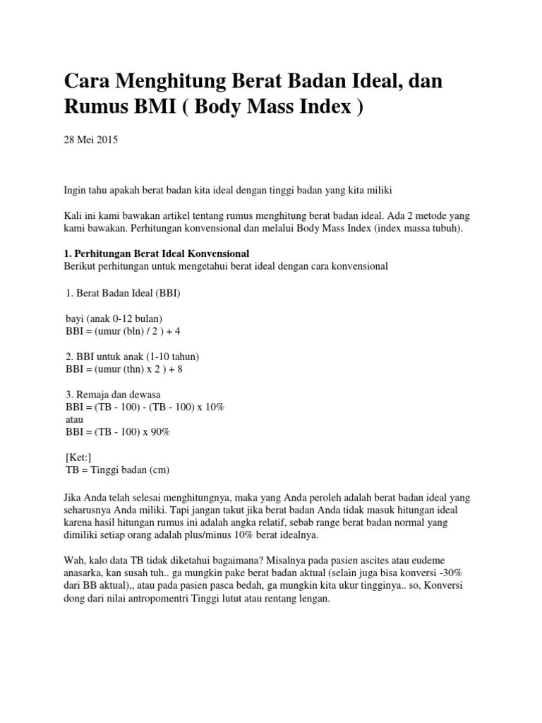 Perlu anda ketahui bahwa sebenarnya untuk mengetahui berat tubuh ideal ada rumus yang bisa anda manfaatkan seperti misalnya rumus bmi dan brocha. Cara menghitung berat badan ideal dengan rumus broca · pria: Selain berat badan, anda juga wajib mengetahui indeks massa . Ketiga cara tersebut digunakan untuk menghitung berat badan ideal orang dewasa. Tinggi badan (cm) · contoh: